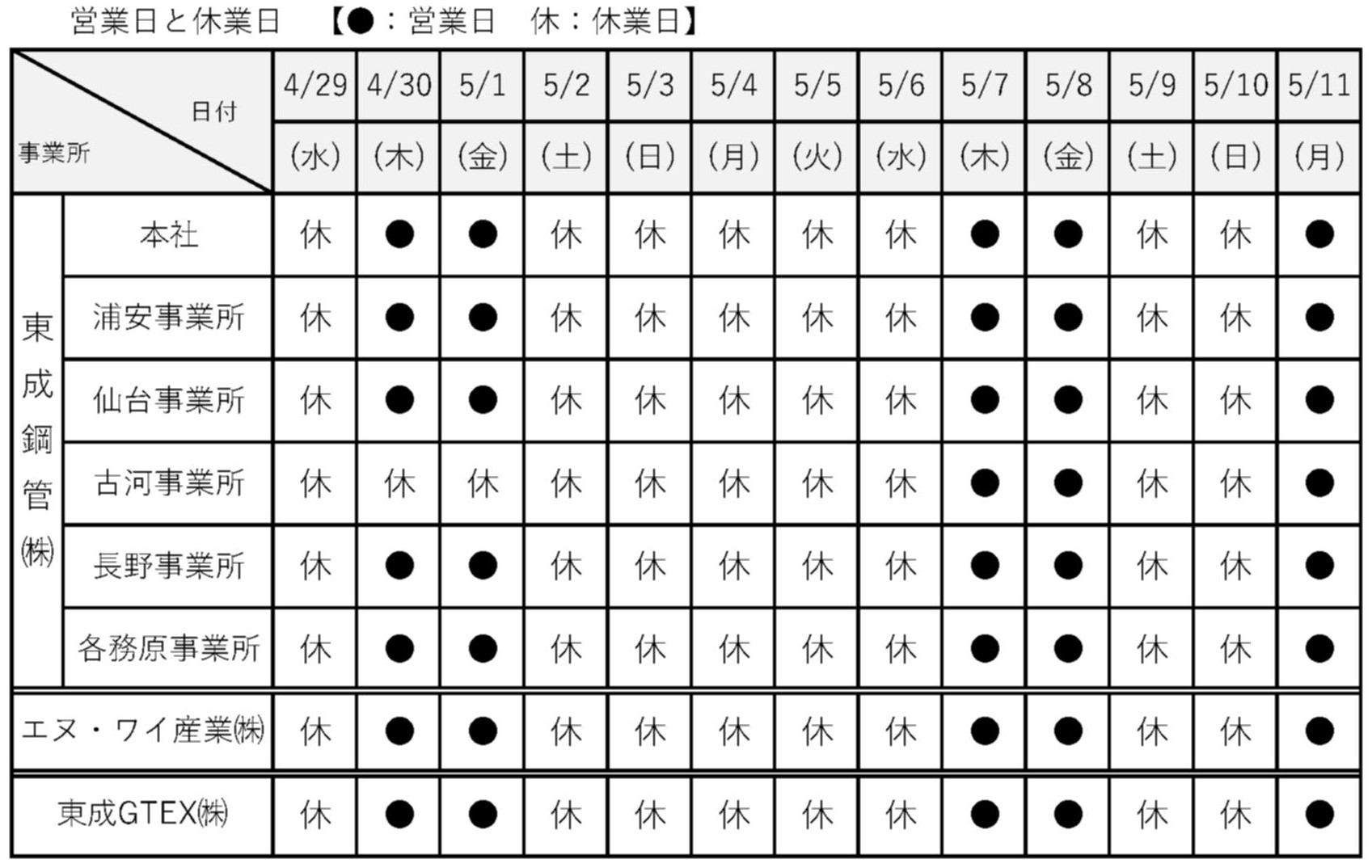誠に勝手ながら、東成鋼管㈱グループ3社のゴールデンウィーク休業を下記の通りとさせていただきます。